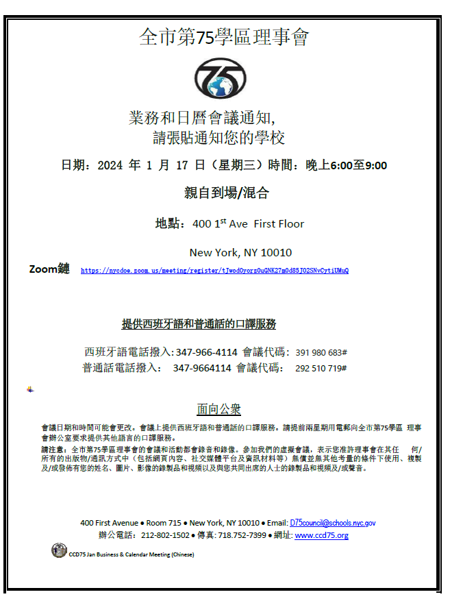CCD75 JOINT HYBRID BUSINESS & CALENDER MEETING 1/17/24 @6PM https://nycdoe.zoom.us/meeting/register/tJwodOyorz0uGNK27m0d85JO2SNvCytiUMuQ https://nycdoe.zoom.us/meeting/register/tJwodOyorz0uGNK27m0d85JO2SNvCytiUMuQ https://nycdoe.zoom.us/meeting/register/tJwodOyorz0uGNK27m0d85JO2SNvCytiUMuQ